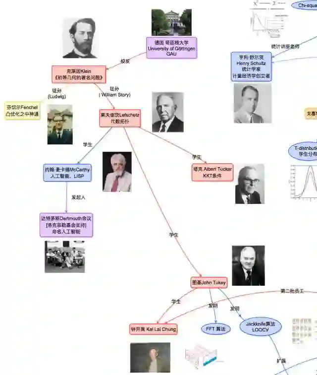 又是克莱因的徒孙Lefschetz, 我们现在提到Lefschetz第三个学生, 前面有发现KKT条件的Tucker, Tucker的学生Minsky和另外一个学生McCarthy创立人工智能。第三个学生 Tukey发明了Jackknife方法, 他的一位华人学生钟开莱在斯坦福大学任教,将Jackknife的影响带到了斯坦福大学, 钟开莱的同事Efron受Jackknife影响, 发明了Bootstrap方法。 从此,开启了斯坦福大学统计学“冲上云霄”模式, 参考”Lasso简史“。