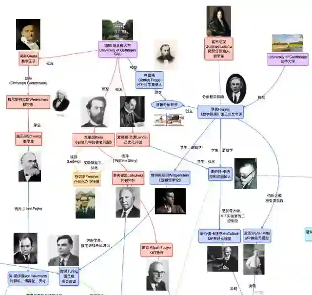 前面讲过,人工智能的发展归根到底都可以看成两个大学的影响:哥廷根大学和剑桥大学(参考“易图秒懂の人工智能诞生")。 如果再仔细看下图,不是还有一个莱布尼茨么? 对的, 除了哲学思想, 微积分创立, 肯定只要有数学分析就有他的影响。