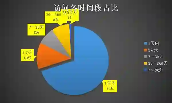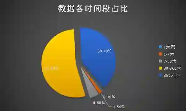 1.、数据量大,PB 级数据,万亿级键值,并且在源源不断的生成中,然而新生成的数据相较于历史存量数据占比小。下图展示了该集群数据在各时间段的一个占比情况。