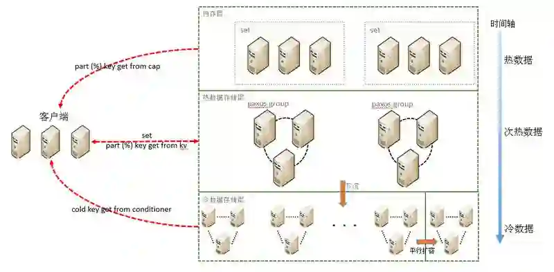 对历史数据,数据存量大,但承担的访问量非常有限,我们当然是不希望用昂贵的固态硬盘来存储它们,因此,系统提供了廉价的机械盘层,并且有一套透明的冷数据剥离和批量下沉的流程,将存储层中历史数据源源不断的抽离到机械盘层。