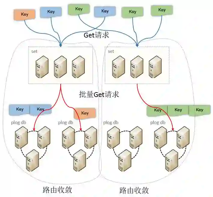因为每个数据都是根据键值单独进行路由的,如果要进行请求合并,我们就必须确保同一个批量请求内的数据,都会寻址到相同的 Paxos Group 上。因此,我们必须在内存层将落到同一台存储机器上的 Get 请求聚合起来。我们首先在内存层和存储层采用了相同的路由算法,然后将内存层的组数同存储层的组数进行对齐,来完成了这一目标。