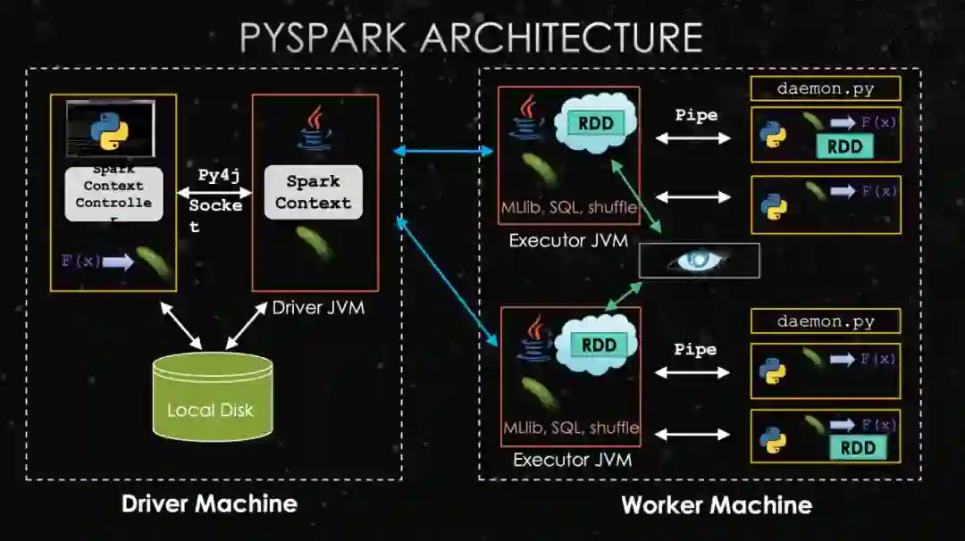 与Spark的区别是,多了一个Python进程,通过Py4J与Driver JVM进行通信。