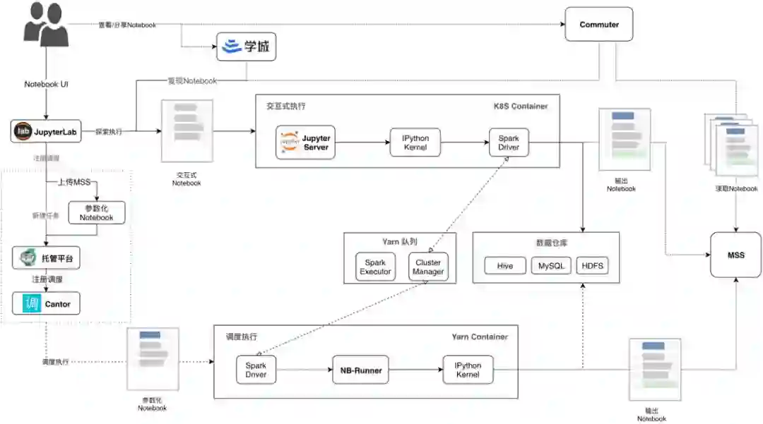 我们的方案是基于JupyterHub on K8s。下图是平台化Jupyter的架构图,从上到下可以看到三条主线:1. 分享复现、2. 探索执行、3. 调度执行。
