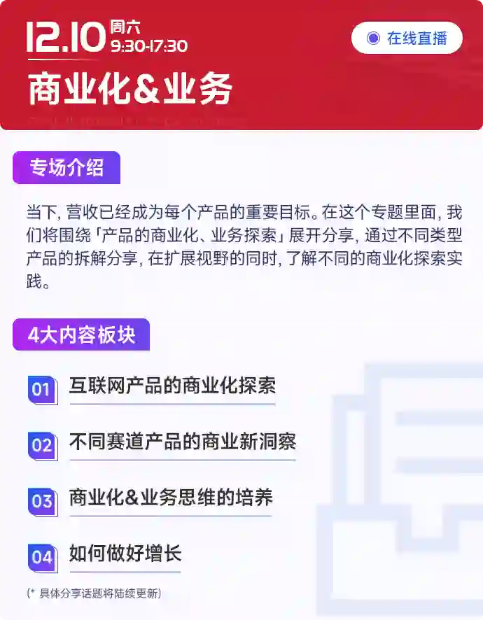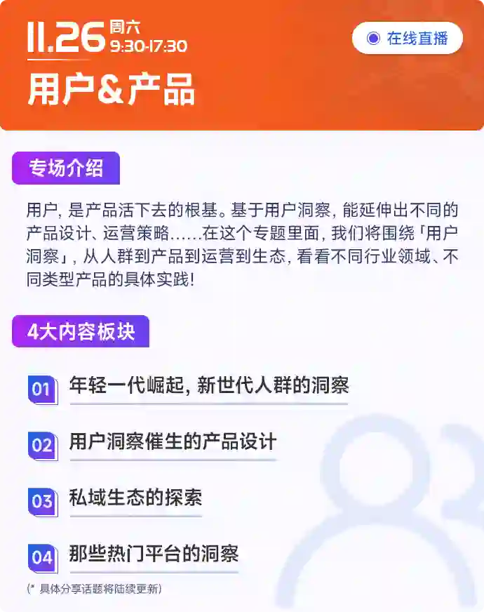用户的需求洞察,产品与用户之间的关系,都是我们在这个专场要去讨论的!