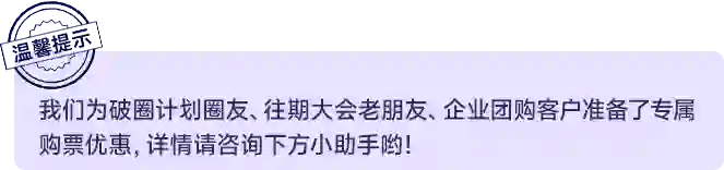 大会商务合作、企业团购现已正式开启!想要探寻品牌获客的更多可能性,或是组织企业员工组团参会,欢迎来撩下方的小助手!