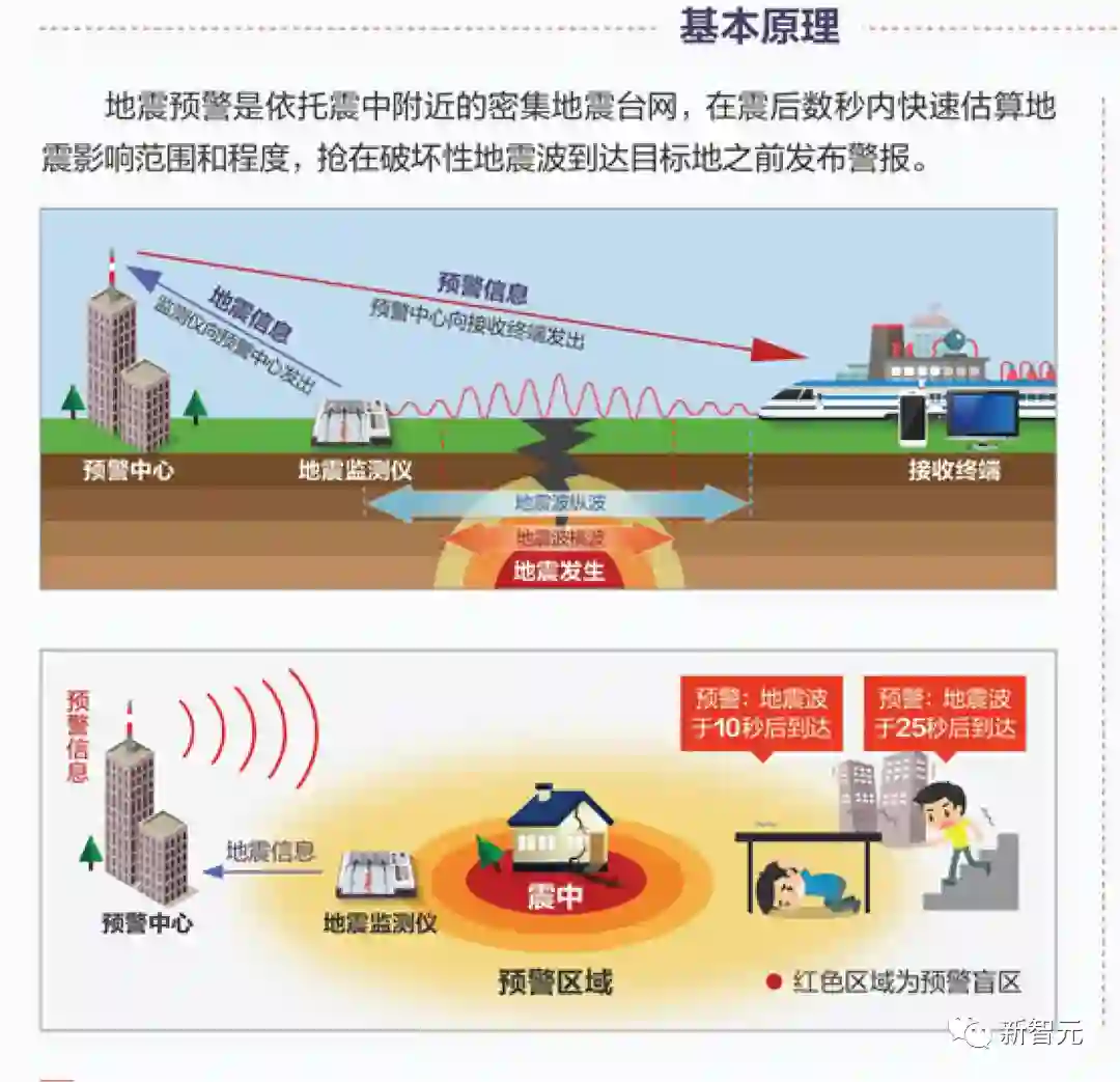 地震波分为纵波和横波,前者传播速度快、破坏力小,后者传播速度慢、破坏力大。地震预警的基本原理,就是利用两者的时间差发出警报。离震源较近的地震观测仪器接收到地震纵波后,实时并持续估计地震参数及其影响,并向地震横波尚未到达的可能受灾区域,提前数秒至几十秒发出警报信息。