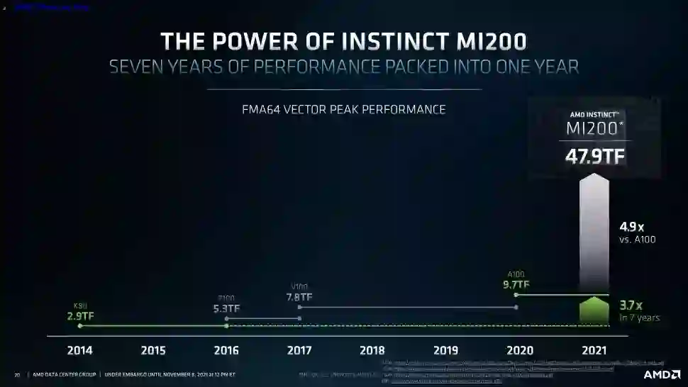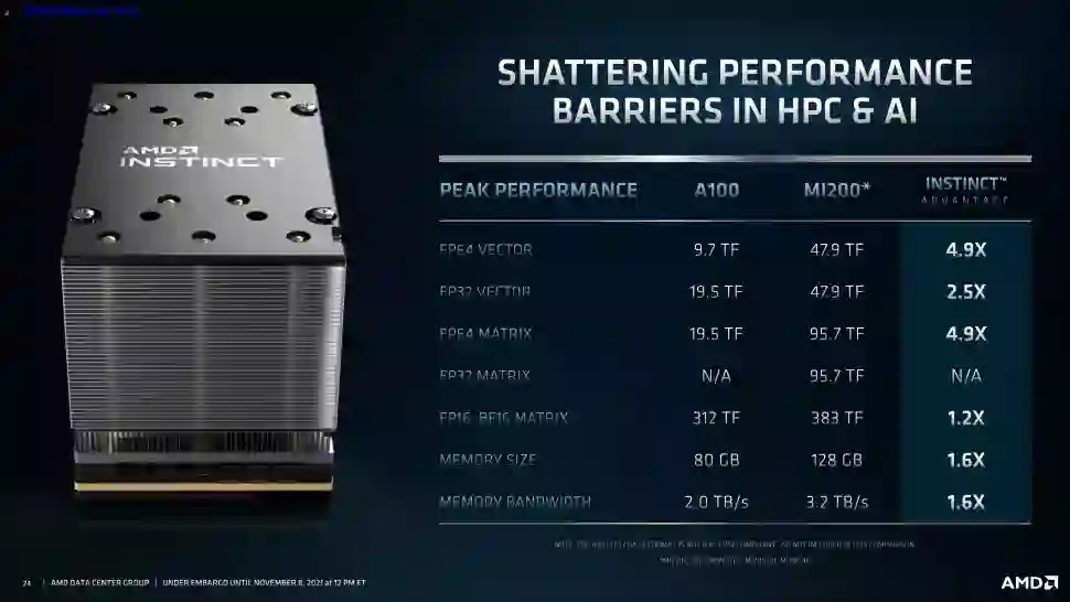 凭借更高的时钟、双GPU和加倍的FP64速率,MI200的FP64向量峰值速率为47.9TFLOPS。比Nvidia A100的FP64向量计算的速率快了4.9倍。