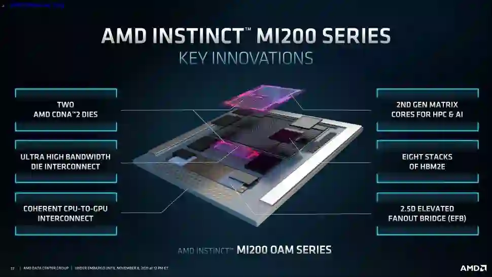 而在今年11月8号的发布会上,AMD推出全新的CDNA 2 GPU架构和MI200 Instinct图形处理器,要与英伟达的A100芯片一较高下。