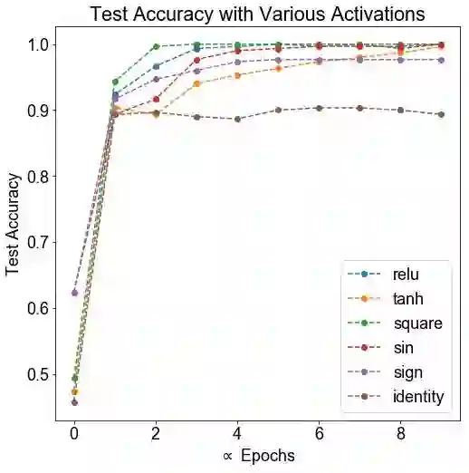 假设: 我们预计恒等函数执行很差(因为直到最后一个 softmax 层,网络仍然保持相当的线性)。我们可能会进一步期望标准的激活函数能够发挥最好的效果。