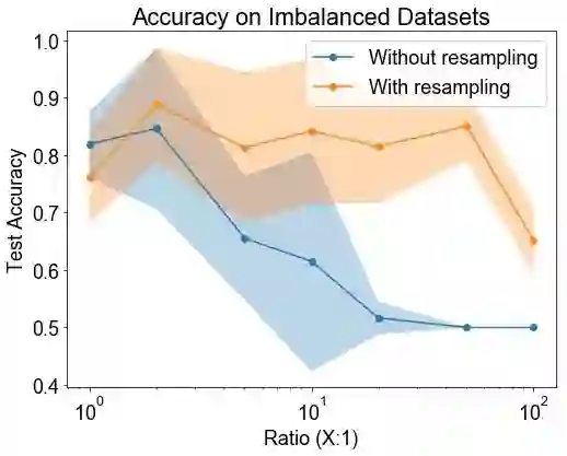 假设:我们预计测试正确率会随着类别不平衡的增加而降低,但我们预计过采样可以缓解这个问题。