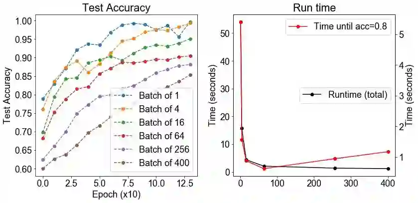 假设: 我们期望较大的批大小会增加正确率(较少的噪声梯度更新),在一定程度上,测试的正确率将会下降。我们预计随着批大小的增加,运行时间应有所下降。