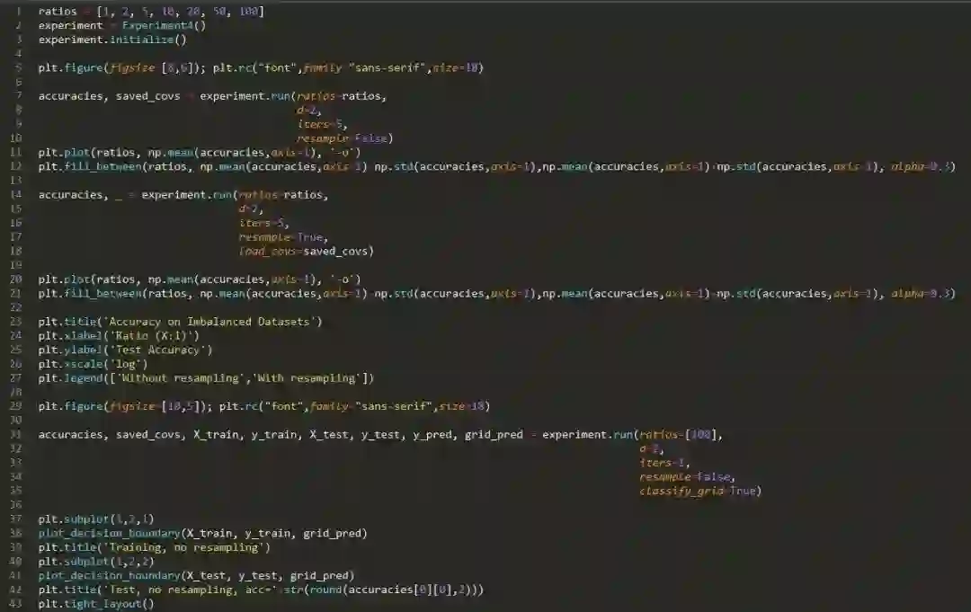 方法:我们生成两个二维的结果(结果未在这里显示,表明相同的结果适用于更高维)高斯,每个产生属于一个类别的数据。两个高斯具有相同的协方差矩阵,但它们的意思是在第 i 个维度上相距 1/i1/i 单位。每个训练数据集由 1,200 个数据点组成,但我们将类别不平衡从 1:1 变为 1:99。测试数据集以 1:1 的比例保持固定,以便于性能比较,并由 300 个点组成。我们还会在每种情况下显示决策边界。