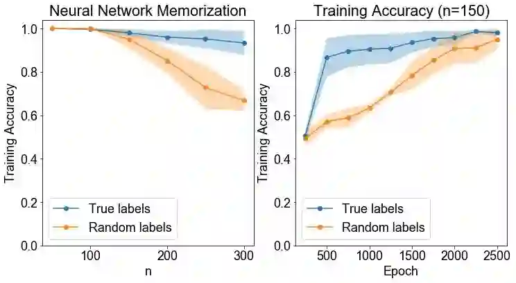 结论: 神经网络的记忆能力约为 150 个训练点。但即便如此,神经网络也需要更长的时间来学习随机标签,而不是真实值(ground truth)标签。