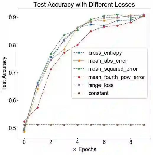 结论: 除去阴性对照外,所有的损失都有类似的表现。损失函数是标签与逻辑之间的区别,提升到四次幂,其性能要比其他差一些。