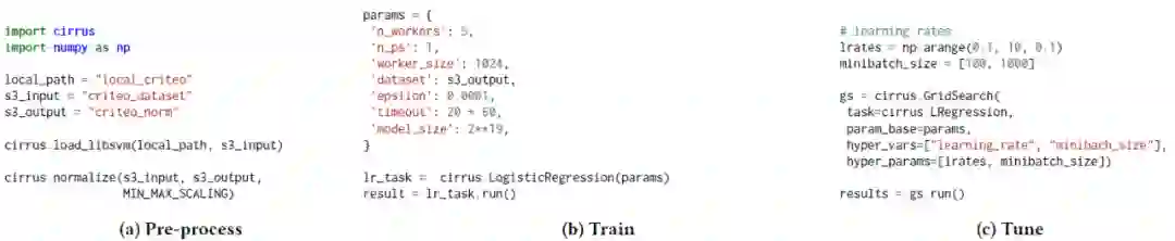图 6. Cirrus API 示例。Cirrus 支持 ML 开发工作流的不同阶段:(a)预处理,(b)训练,和(c)超参数调优。