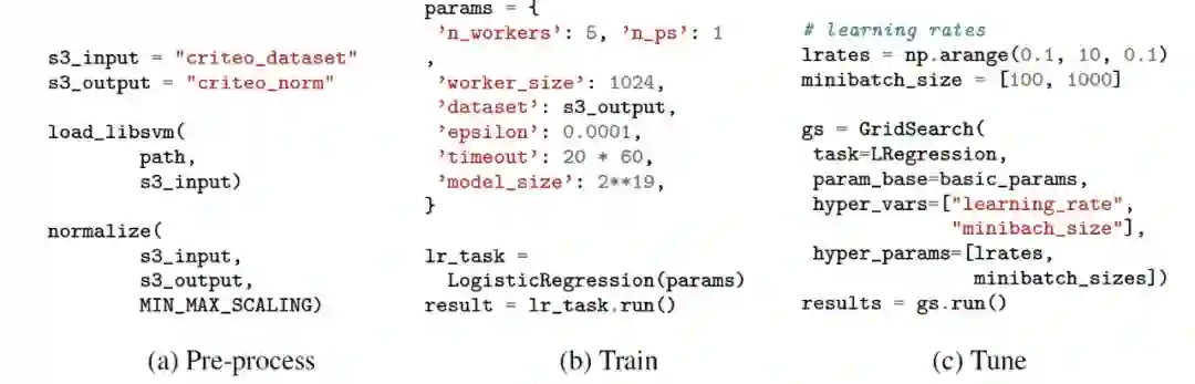 作者给出了一个例子来展示这个 API 的功能——图 1 中给出基于 Criteo Kaggle 竞争开发模型的过程,该模型用于预测用户点击显示广告数据集的广告的概率。工作流的第一步是加载数据集并将其上载到 Amazon S3。例如,用户可以调用 load_libsvm 方法来加载以 LIBSVM 格式存储的数据集,解析数据后自动为其创建分区,然后将其上载到 Amazon S3。第二步,一旦数据加载到 Amazon S3 中,就可以立即进行预处理。系统应该提供一些开发人员常用的预处理方法。例如,用户可以通过使用 Amazon S3 中数据集的路径调用 normalize 函数来规范化数据集。一旦加载了数据,用户就可以通过查看系统的测试损失来训练不同的模型并查看它们的性能。一旦用户对某个特定的模型获得了合理的损失,他们就可以通过超参数搜索对其进行微调。此外,作者设想这样一个系统允许用户在每个阶段的执行过程中进行多次交互。例如,当超参数搜索任务正在运行时,用户应该能够监视每个单独实验的测试损失。对于表现不好的实验(例如,测试损失发散(test loss is diverging)),用户应该能够终止它们。这个特性可以通过交互环境(比如 Jupyter)中的用户界面来实现。