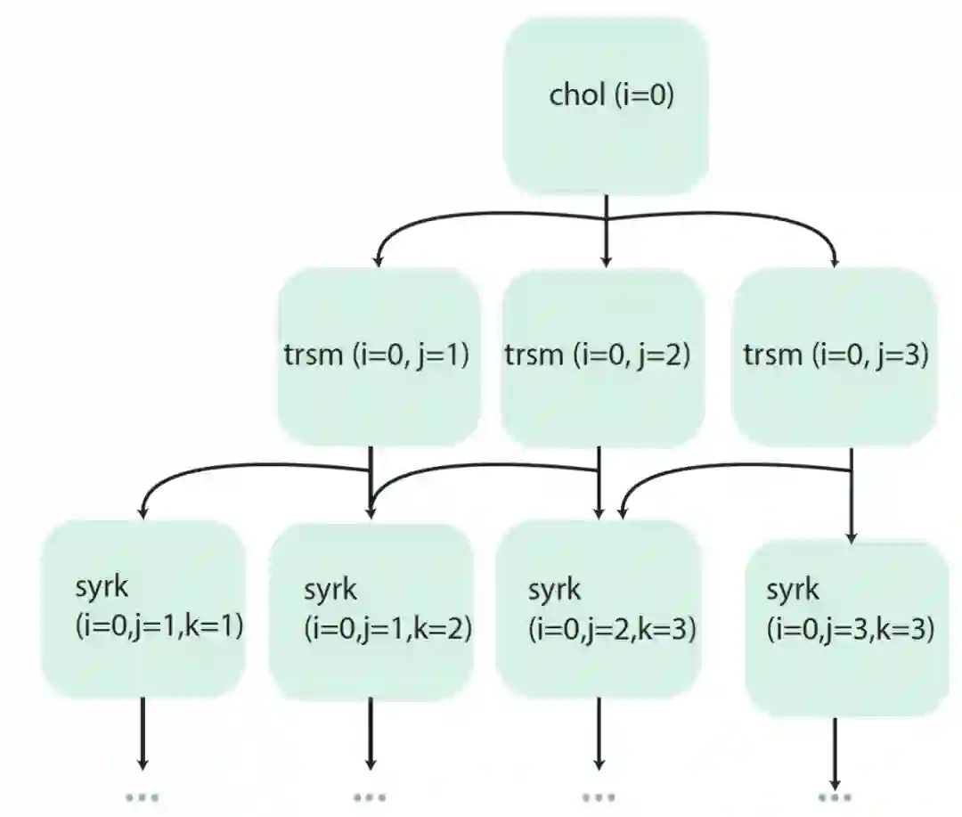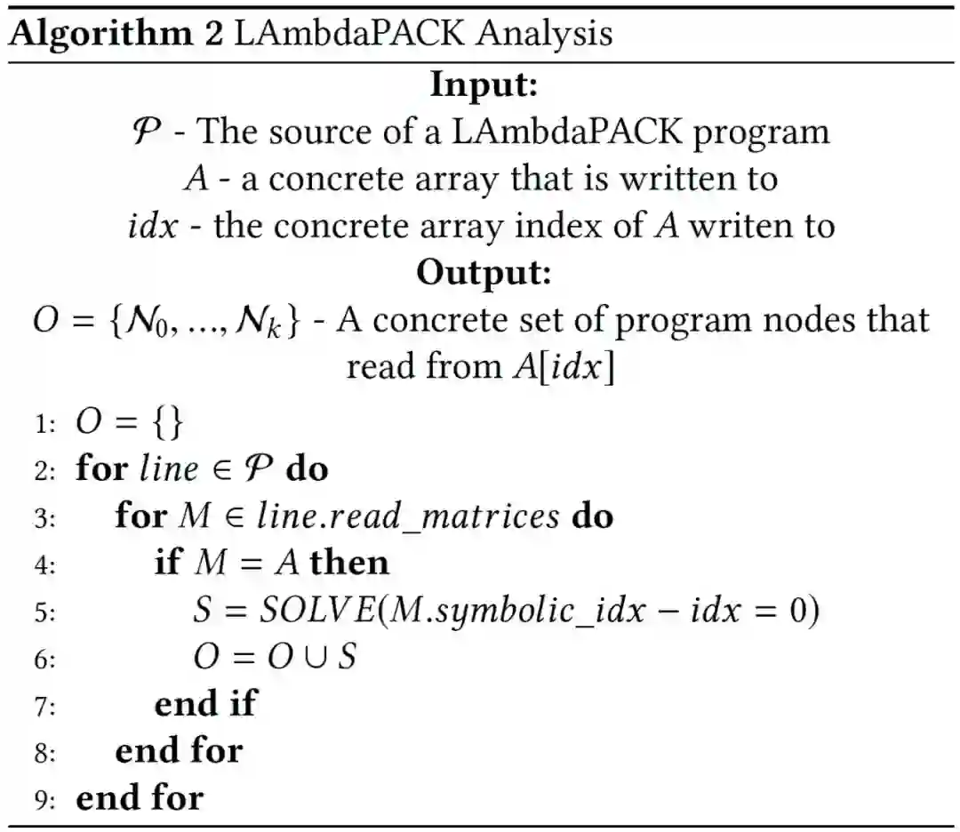 LAmbdaPACK 中没有并行原语,而是 LAmbdaPACK runtime 通过静态分析程序来推断底层依赖关系图。为了并行执行程序,作者从程序产生的依赖结构构造了一个内核调用的 DAG。作者借用并扩展了循环优化技术(loop optimization),将 LAmbdaPACK 程序转换为隐式有向无环图(Implicit DAG)。将程序 DAG 中的每个节点 N 表示为一个元组(line_number, loop_indices)。利用这个信息,可以执行程序迭代空间中的任何语句。