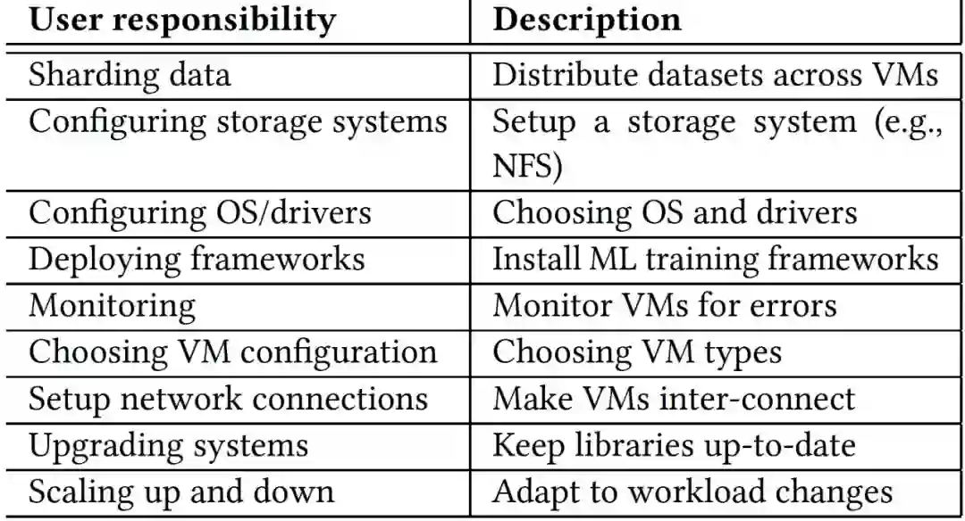 二是,ML 用户需要应对复杂的管理问题,他们面临着为每个 ML 工作负载提供、配置和管理这些资源的挑战。利用 VMs 进行机器学习工作负载的系统通常需要用户重复执行一系列繁重的任务,表 1 中展示了一些任务。这种管理复杂性阻碍了交互和迭代用例,降低了用户生产力和模型的有效性。