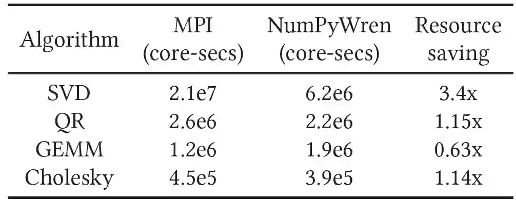表 4. 在一个 256K 大小的方阵上运行算法的 MPI 与 NumPyWren 总 CPU 时间(以核秒为单位)比较。