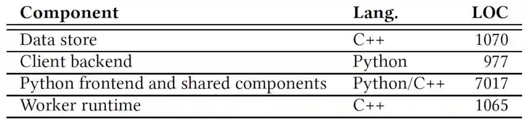 Cirrus 的整体结构与节 2.1 中是类似的。Cirrus 的前端和客户端后端是用 Python 实现的,方便 Cirrus 与现有的机器学习方法相结合。为了提高效率,分布式数据存储和 worker runtime 用 C++ 实现。表 2 列出了实现的不同组件以及它们的大小和实现语言。Worker runtime 代码包括迭代器接口和数据存储客户端实现。worker runtime 和数据存储通过 TCP 连接进行通信。作者实现了一个共享组件库,其中包括线性代数库、通用实用程序和 ML 算法,这些组件被所有系统组件共享。作者已经公开发布了 Apache 2 开源许可的实现(https://github.com/ucbrise/cirrus)。