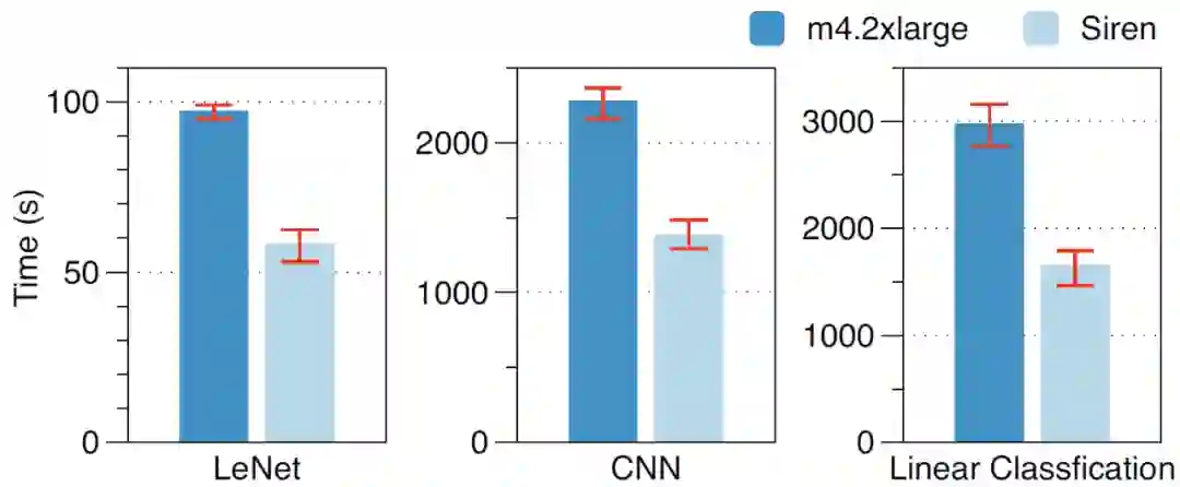 进一步的,作者在 m4.2xlarge instances 的集群上训练 LeNet、CNN 模型和线性分类模型并确定相应的成本。然后,在成本相同的情况下在 m4.2xlarge×8 集群上用 SIREN 训练同样的模型。图 15 中的实验数据显示,与相同成本的 EC2 集群相比,SIREN 使用这些模型分别减少了 40%、39.4% 和 44.3% 的训练时间。
