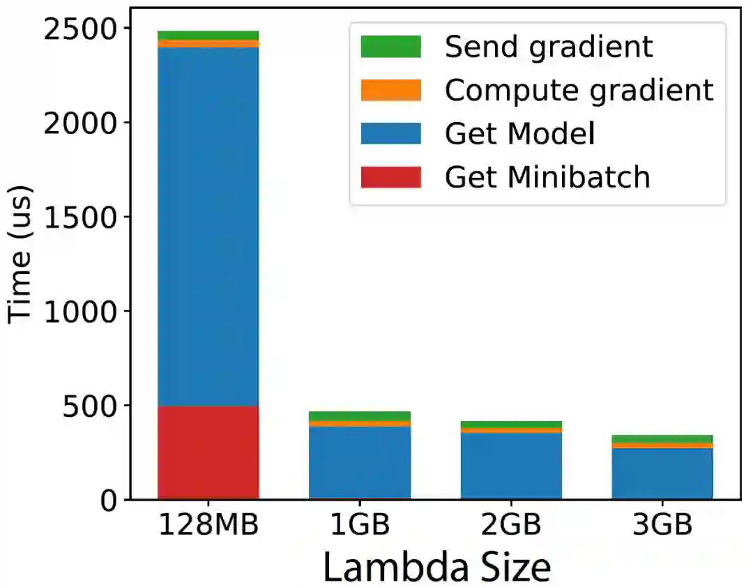 此外,作者还构建了本文所提出的框架的原型,包括:(1)具有参数服务器接口的高性能数据存储,(2)mini-batch 数据的循环缓冲区预取,(3)逻辑回归 SGD 训练算法。为了充分验证这种设计的好处,作者在相同的逻辑回归任务中对其进行了评估。作者测量了每个 worker 的平均 SGD 迭代时间(见图 3)。这个时间是 worker 性能的一个指标;较低的迭代时间意味着更频繁的模型更新和更快的收敛。作者还将这一次的 SGD 算法分解为四个主要步骤:(1)从数据存储中获取最新模型,(2)从远程存储(例如 S3)中获取一个 minibatch,(3)计算 SGD 梯度,以及(4)将梯度发送到数据存储。作者发现,尽管无服务器计算具有固有的开销,本文所提出的框架原型还是实现了较低的每次迭代时间( 500 μs)--- 与 Bosen 这样的系统不相上下。这种性能源于两种机制:(1)远程 mini-batch 的有效预取和缓冲,以及(2)尽可能与数据存储通信。首先,minibatch 预取机制通过与计算并行进行,有效地掩盖了从 S3 获取 minibatch 所需的时间。实际上,对于中型 / 大型 Lambda,在新的 minibatch 上开始计算所需的时间可以忽略不计,因为大多数情况下,这些数据都是在 worker 需要之前缓存在内存中的。即使从 S3 获取一个 mini-batch 需要 10ms 也是这样的。其次,作者发现与数据存储的通信是有效的(例如,发送梯度的时间可以忽略不计)。由于能够与数据存储异步通信,进一步提升了该框架的性能。