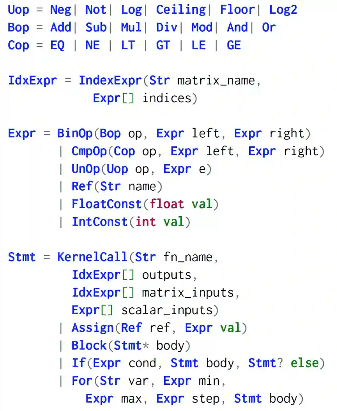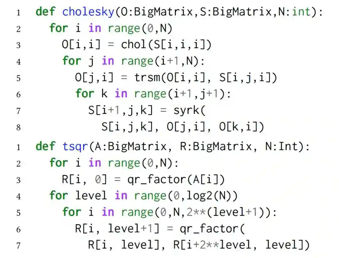 首先,我们介绍本文提出的 LAmbdaPACK:一种用于实现并行线性代数算法的特定语言。LAmbdaPACK 是生成和使用矩阵块(Tiled matrices)的命令式程序。这些程序可以对标量值执行基本的算术和逻辑运算。它们不能直接读取或写入矩阵值;相反,所有实质性的计算都是通过调用矩阵块上的本机内核来执行的。矩阵块由索引引用,LAmbdaPACK 程序的主要作用是对内核调用排序,并计算每个调用的分块索引。LAmbdaPACK 包括简单的 for 循环和 if 语句,但是没有递归,只有从 LAmbdaPACK 到内核的一级函数调用。每个矩阵块索引只能写入一次,这是许多函数式语言的共同设计原则。LAmbdaPACK 中的原语功能强大,包括 Tall Skinny QR(TSQR)、LU、Cholesky 和奇异值分解等等。LAmbdaPACK 的示例性描述如图 17 所示。