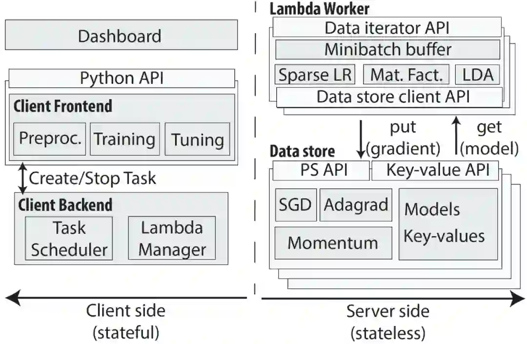 图 4. Cirrus 系统结构。系统由(有状态的)客户端(左)和(无状态的)服务器端(右)组成。预处理和面向用户的训练包含一个前端的 API。客户端后端管理云功能和向函数分配任务。服务器端由 Lambda Worker 和高性能数据存储组件组成。Lambda worker 将数据迭代器 API 导出到客户端后端,并包含许多迭代训练算法的有效实现。数据存储用于存储梯度、模型和中间预处理结果。