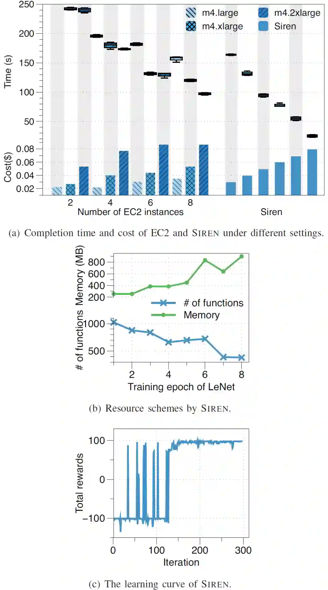 图 14 的实验对比 SIREN 和 EC2 上的 MXNet。图 14(a)显示了使用 12 个 EC2 集群和使用 SIREN 训练 LeNet 的完成时间和相应的成本。由于 EC2 集群的异质性,EC2 上的成本与训练完成时间呈非线性关系。例如,m4.xlarge×6 集群和 m4.2xlarge×6 集群几乎在同一时间完成训练,但后者产生的成本是前者的两倍。相比之下,SIREN 通过更多的投资缩短了完成时间。图 14(b)显示,SIREN 动态调整每个训练 epoch 的函数及其内存。当函数数量减少时,每个函数收到的训练数据分区更大,需要更大的内存来处理数据分区。SIREN 中的 DRL agent 是通过与 AWS Lambda 在线交互进行训练的。从图 14(c)中的学习曲线可以看出,经过 150 次左右的迭代,DRL agent 的训练已经完成。