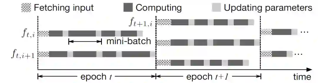 在 epoch t 中,假设函数 f_t,i 花费一个完整周期(P^F)_t,i 来获取 mini-batch 数据,(P^C)_t,i 计算梯度,(P^U)_t,i 更新模型参数。函数 i 在 epoch t 的完整执行时间为: