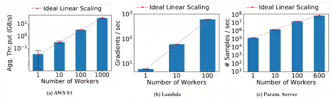 :Cirrus 通过将 S3 中的训练数据集分割成中等大小的对象来解决这个问题。作者使用 10MB 的对象,因为作者发现这个大小可以实现良好的网络利用率,同时对于最小尺寸的 Lambda 来说也足够小。通过使用大型对象,减少了每秒的请求数量。因此,当每个 worker 从 S3 消耗 30MB/s 的训练数据时,能够将 S3 的吞吐量线性扩展到 1000 个 Cirrus workers(图 8a)。
