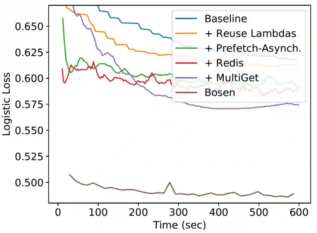为了评估对 ML 无服务器框架的需求,作者引入两个框架进行性能比对:PyWren[3]和 Bosen[4]。PyWren 是一个专门用于无服务器架构的 Map-reduce 框架。PyWren 提供了可缩放到数千个 workers 的 map 和 reduce 原语。Bosen 是一个分布参数框架,专门用于基于 VM 的 ML 算法。为了进行评估,作者在 PyWren 上实现了一个异步 SGD 训练算法。在 PyWren 基线实现的基础上,作者还进行了一组优化。作者使用了来自 Criteo Kaggle 竞赛的 Criteo 展示广告数据集进行实验。作者在 10 个最大的 AWS Lambda(3GB 内存)上运行 PyWren,在单个 VM(m5.2xlarge1)中的 8 个内核上运行 Bosen。