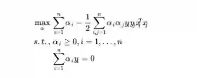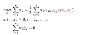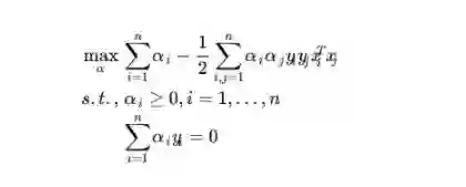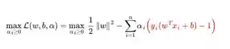 (2)、求 α 对的极大,即是关于对偶问题的最优化问题。经过上面第一个步骤的求w和b,得到的拉格朗日函数式子已经没有了变量w,b,只有 α。从上面的式子得到: