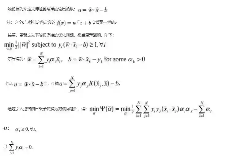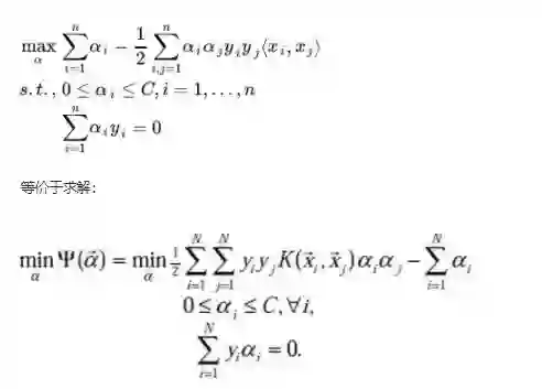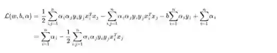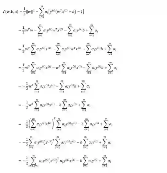 也就是说,原始问题通过满足KKT条件,已经转化成了对偶问题。而求解这个对偶学习问题,分为3个步骤:首先要让L(w,b,a) 关于 w 和 b 最小化,然后求对 α 的极大,最后利用SMO算法求解对偶问题中的拉格朗日乘子。