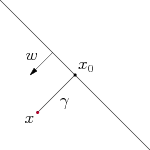 假定对于一个点 x ,令其垂直投影到超平面上的对应点为 x0 ,w 是垂直于超平面的一个向量,