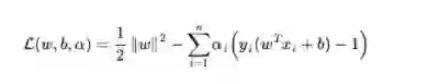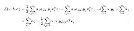 从上面的最后一个式子,我们可以看出,此时的拉格朗日函数只包含了一个变量,那就是 αi(求出了 αi 便能求出w,和b,由此可见,上文第1.2节提出来的核心问题:分类函数