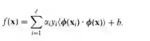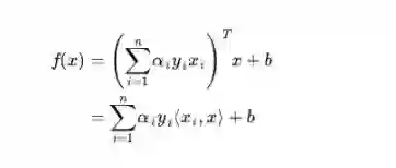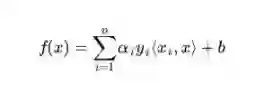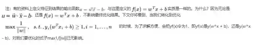换言之,在进行分类的时候,遇到一个新的数据点x,将x代入f(x) 中,如果f(x)小于0则将x的类别赋为-1,如果f(x)大于0则将x的类别赋为1。