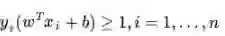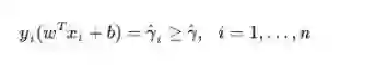 而超平面(w,b)关于T中所有样本点(xi,yi)的函数间隔最小值(其中,x是特征,y是结果标签,i表示第i个样本),便为超平面(w, b)关于训练数据集T的函数间隔: