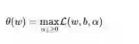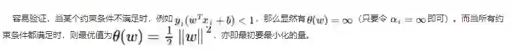 ,实际上等价于直接最小化θ(W)(当然,这里也有约束条件,就是αi) ,因为如果约束条件没有得到满足,θ(W)会等于无穷大,自然不会是我们所要求的最小值。