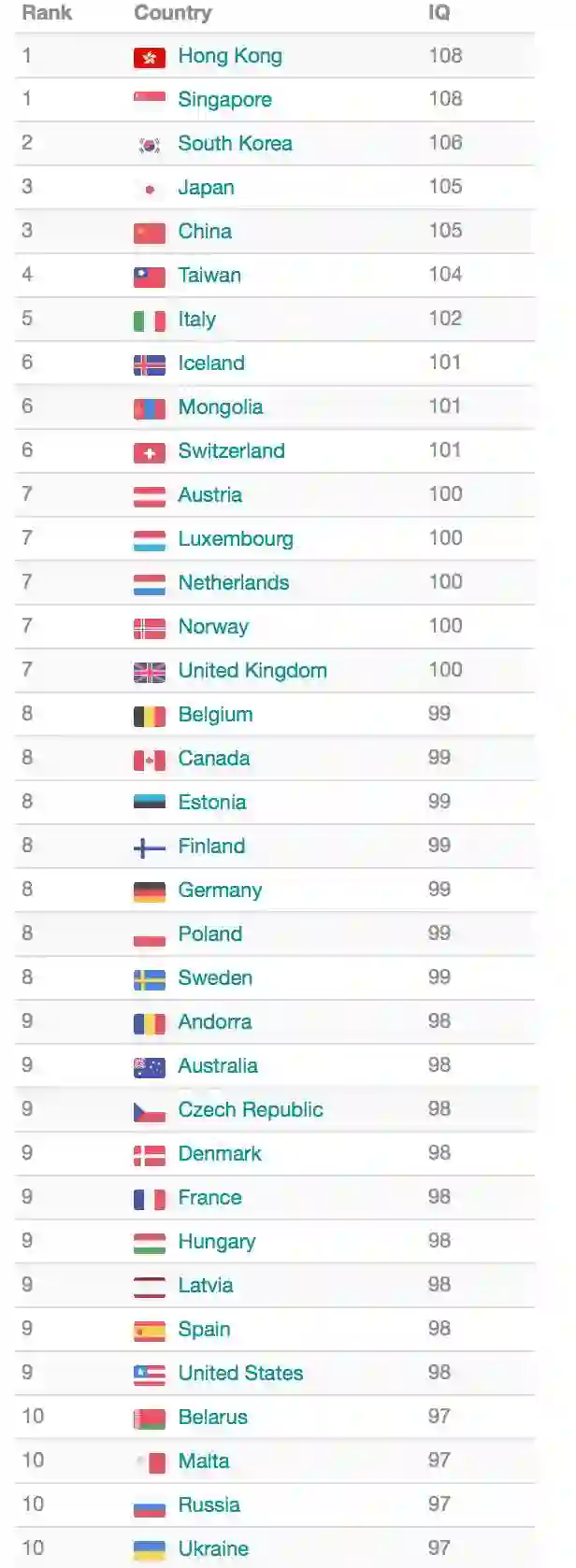 这是在调查中排名前 10 位的国家和地区,其中有不少名词是并列的。我们可以看到,中国香港和新加坡的国家平均 IQ 最高,达到 108。中国的国家平均 IQ 是 105,和日本并列第三。排在第二的是韩国(106)。美国的国家平均 IQ 是98,排在第9。