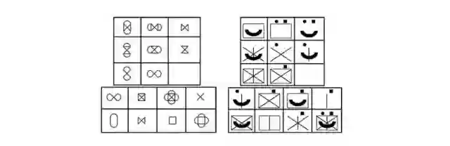 上图是瑞文标准推理测验中的一道题目。根据题目中所展示的元素之间的关系,答题者被要求在空缺中填出应有的图形组合,选项一般有 6 - 8 个。