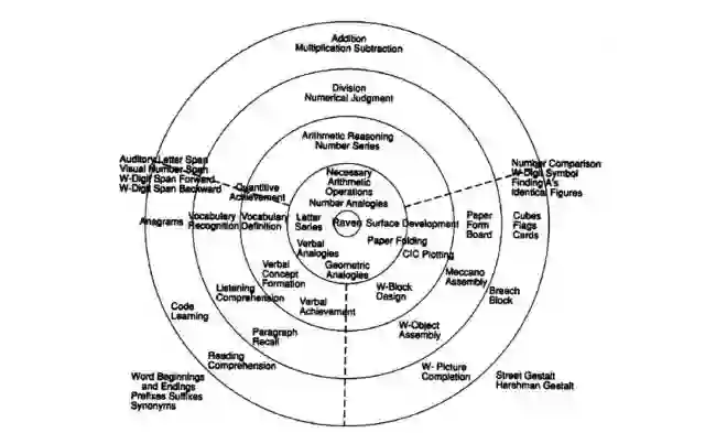 在这种分析中,视觉(或者几何学)、口语和数学的类比方法都围绕着 RPM 进行聚合,这意味着,二者之间有着强大的关联,所以从整体上能对二者进行衡量。确实,RPM 能被看成是一个复杂的几何学类比问题,其中被试者必须定义首先出现的两张图片和顶层最上面一张图片之间的关系,进而计算出一个能在底部产生类比联系的图像。与这一说法相一致,Holyoak 和同事展示了,在进行类比的地图绘制和检索时,高的 RPM 表现要求更少的协助。
