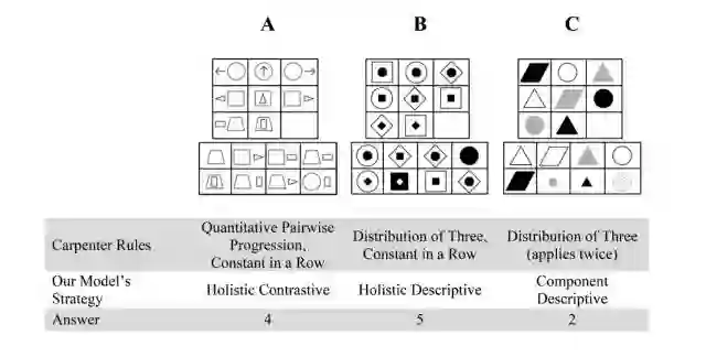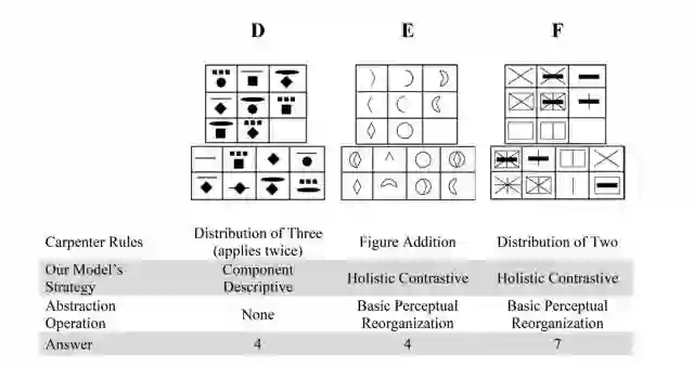 上图展示了 RPM 测试题(模拟题)的“智能考察点”,即所谓的 Carpenter rules (Carpenter 等,1990),以及研究者所开发的模型在解题时所采取的策略。