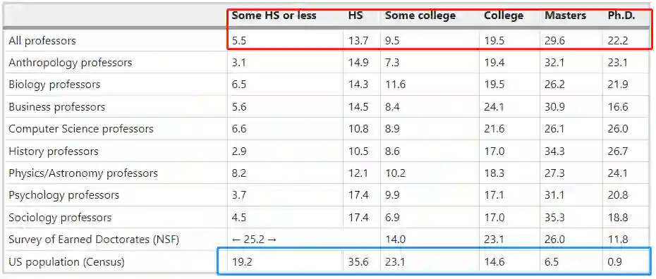 相比之下,在与这些教授出生时间一致的美国成年人中,平均只有不到1%的人拥有博士学位,只有7.4%的人拥有研究生学位。