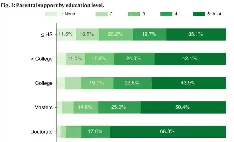 数据显示,高达68.3%的博士父母会为孩子的学术生涯提供大力支持,而高中及以下的父母仅有35.1%。