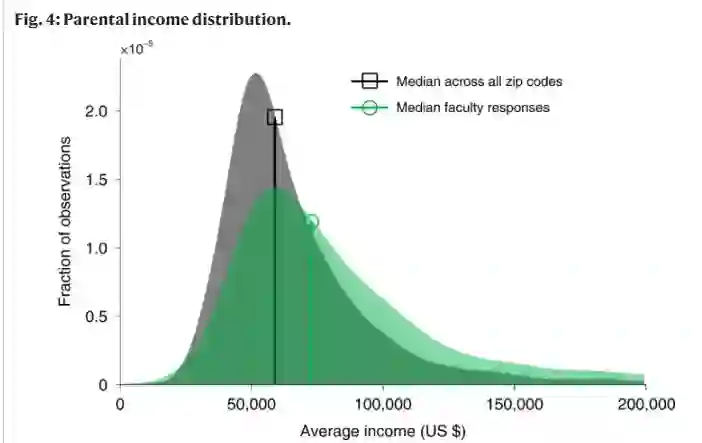 在这篇名为《Socioeconomic roots of academic faculty(学术教师的社会经济根源)》的论文中,研究人员调查了7204名美国大学终身教授,统计了他们童年时期父母的社会经济地位(SES)和父母最高教育水平等信息,并与同一时期的一般人口模式进行对比。