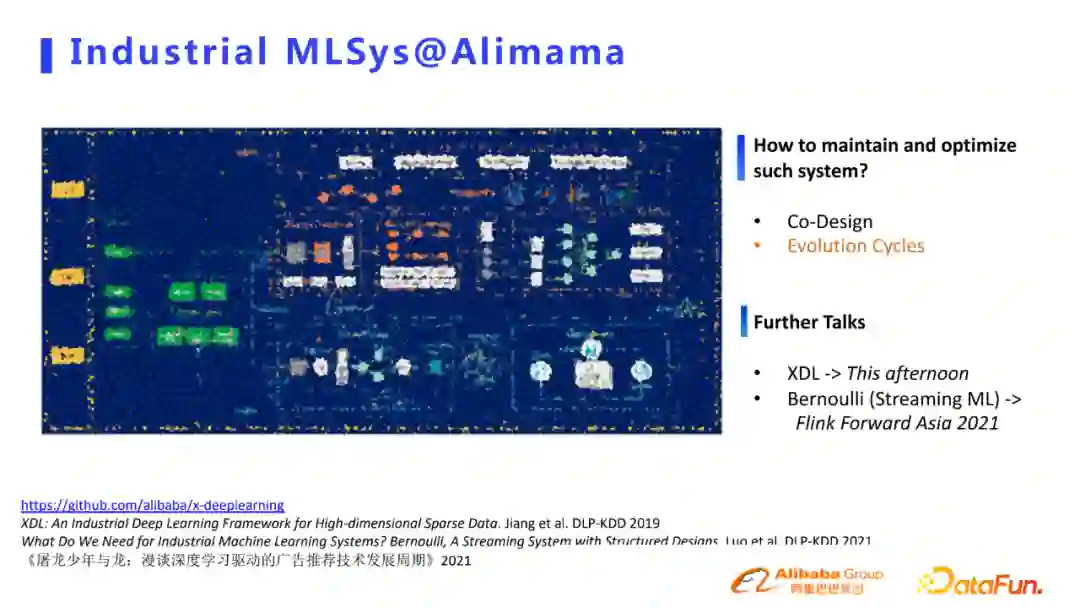 另一方面,到了工业界中,训练和推理很可能是要被分开去做的。因为在推理的时候你只需要处理一个固定的计算图,这就存在很多优化的空间。如果一定要把训练和推理一体化,就可能带来很多系统上的难点,所以主流的做法是会把推理和训练分开。此外,用户点击率模型的模型参数往往会很大,模型又要求实时更新,工业应用中又还有资源调度的问题等等。这里面很多问题都是和框架本身的设计或是接口设计息息相关。
