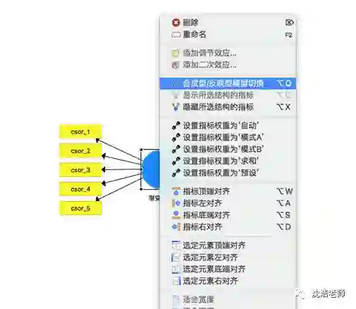 数据导入完整后开始建模,选中csor(责任感)的5项指标并拖动到建模界面中,可得一个潜变量建构。