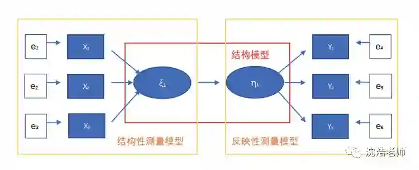 在传统的SEM中,观测变量与潜变量之间为线性函数关系,潜变量的意义通过观测变量反映,潜变量的变化会导致观测标量的变化。(X1表示观测变量,e1表示误差, ξ1表示潜变量,λ1表示系数)
