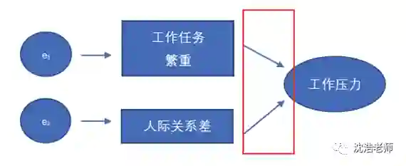 然而,有些时候,潜变量的意义是由测量变量来决定的,这一类测量模型就称为形成性测量模型(Formative Measurement Model),所对应的测量变量即为形成性指标(Formative Indicator)。举个例子:工作任务繁重,人际关系差等造成了工作压力。